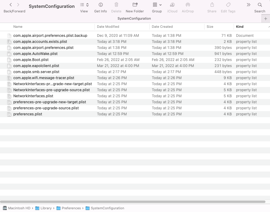 이 부분은 파일들을 지워주는 것이라 긴가 민가해서 여러 사이트를 찾아보았는데, 지우라는 파일의 개수가 다르기는 했지만 네트워크 설정을 리셋해주려면 파일을 지워야 한다는 설명은 동일해서 해보았습니다. 그리고 파일을 지우더라도 맥북을 다시 껐다 켜면 지웠던 파일이 다시 생기니 걱정하지 않으셔도 됩니다. 우선 폴더나 Finder를 엽니다. 그리고 단축키로 커멘드 + 쉬프트 + G 버튼을 눌러 줍니다. (맥용 키보드에서 스페이스 왼쪽 옆에 있는 cmd 버튼과 shift 버튼, 그리고 영어 문자 버튼 G를 같이 눌러 줍니다.) 그러면 어떤 폴더로 바로 이동할 수 있는 이동창이 뜹니다. 거기에 /Library/Preferences/SystemConfiguration/을 치고 엔터를 눌러줍니다. 대소문자 상관없습니다. 그럼 아래의 폴더가 나옵니다. 여기서 다섯 개의 파일을 지울 수도 있고, 세 개의 파일을 지울 수도 있습니다. 제가 본 영문 사이트에서는 2번, 4번, 5번을 지우라고 했고, 다른 한국 사이트에서는 몬터레이로 업데이트 후 인터넷이 이상할 때 이 다섯 개 파일을 모두 지우라고 하는 걸 봤습니다. 저는 이 다섯 개의 파일을 모두 지웠습니다. 그런데 지금 확인해보니 1번 파일은 목록에서 보이지 않네요; 어떻게 된 건지는 모르겠지만 인터넷은 잘 됩니다. 지우는 파일에 대해서 애매하다고 생각된다면 이 부분은 좀 더 찾아보시고 지우시는 게 좋을 것 같습니다.