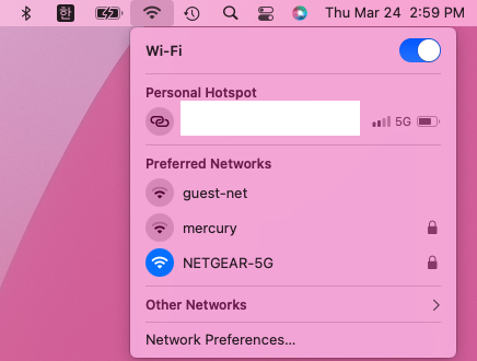 오른쪽 상단에 와이파이 모양을 눌러서 'network preferences' 버튼을 누릅니다.