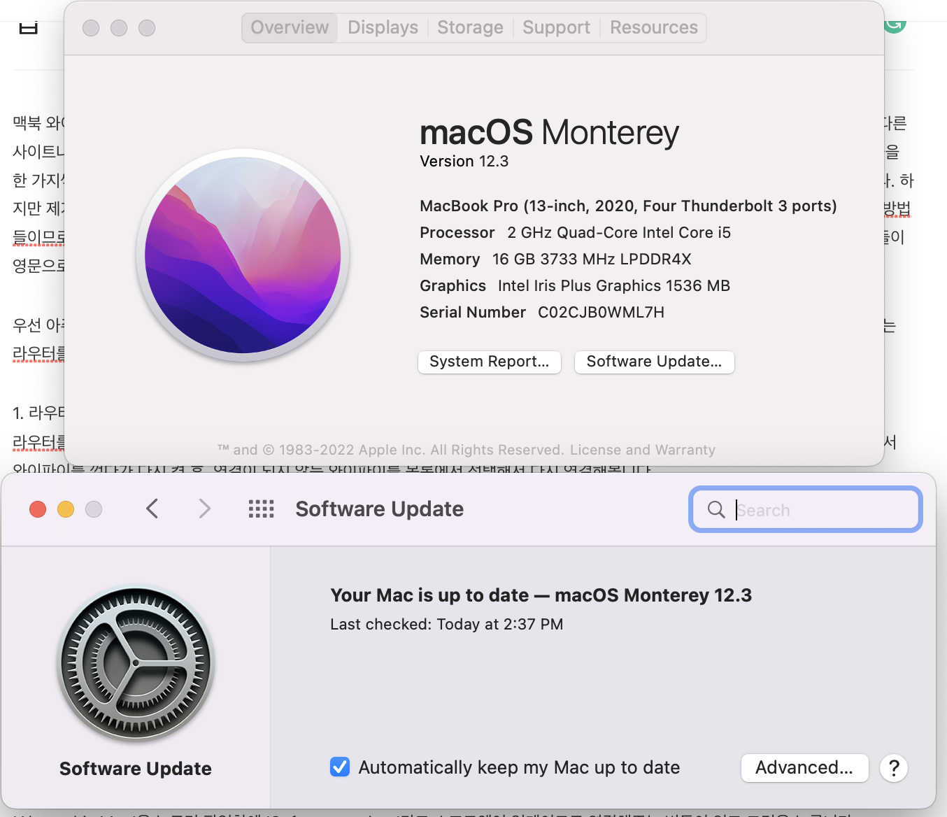 맥북의 운영체제가 최신 버전이 아니어서 와이파이를 연결하는데 어떤 문제가 생긴 것일 수도 있습니다. 왼쪽 상단 사과 모양을 눌르고 'About this Mac'을 누르면 팝업창에 'Software update'라고 소프트웨어 업데이트로 연결해주는 버튼이 있고 그것을 누릅니다. 그러면, 이와 같이 소프트웨어 업데이트 창이 뜨고 맥북이 현재 최신 버전인지 아닌지를 확인해 줍니다. 저는 백묵 Monterey (몬터레이) 업데이트를 마친 상태이므로, "Your Mac is up to date"라고 뜨고 옆에 운영체제 버전이 쓰여있습니다. 만약, 최신이 아니라면 그 옆에 update start라는 버튼이 나오므로 그것을 누르고 소프트웨어 업데이트를 해주면 됩니다. 근데 이 업데이트를 해주는 경우에 약 30분에서 1시간 정도가 소요될 수 있습니다. 그러므로 시간이 없다면 이렇게 맥북의 소프트웨어 프로그램을 업데이트하는 방법은 다른 방법을 먼저 시도해보고 나서 그래도 안되거나 하면 해보세요.
